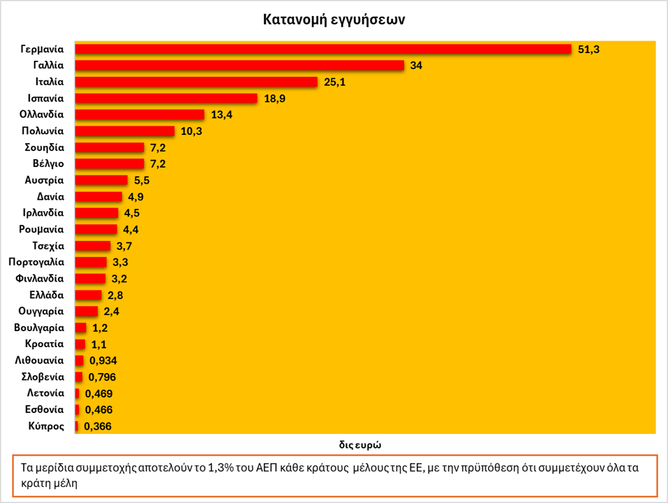 Πηγή: POLITICO. Here’s how EU capitals would divvy up Ukraine loan backstop under €210B frozen assets plan. Στο: https://www.politico.eu/article/eu-capitals-frozen-assets-loan-ukraine-russia-war-finances/#:~:text=Here’s%20how%20EU%20capitals%20would%20divvy%20up,a%20proposed%20loan%20against%20frozen%20Russian%20assets. (Γράφημα δικό μου)