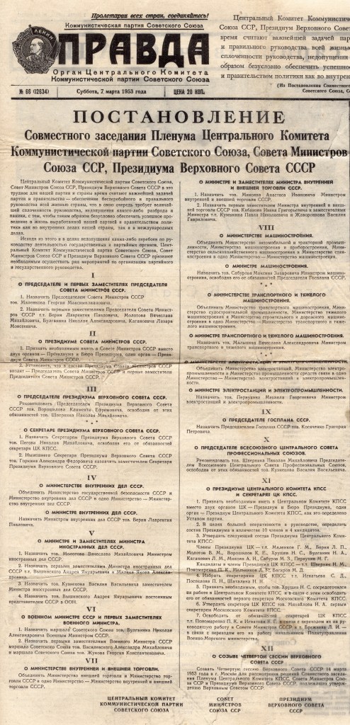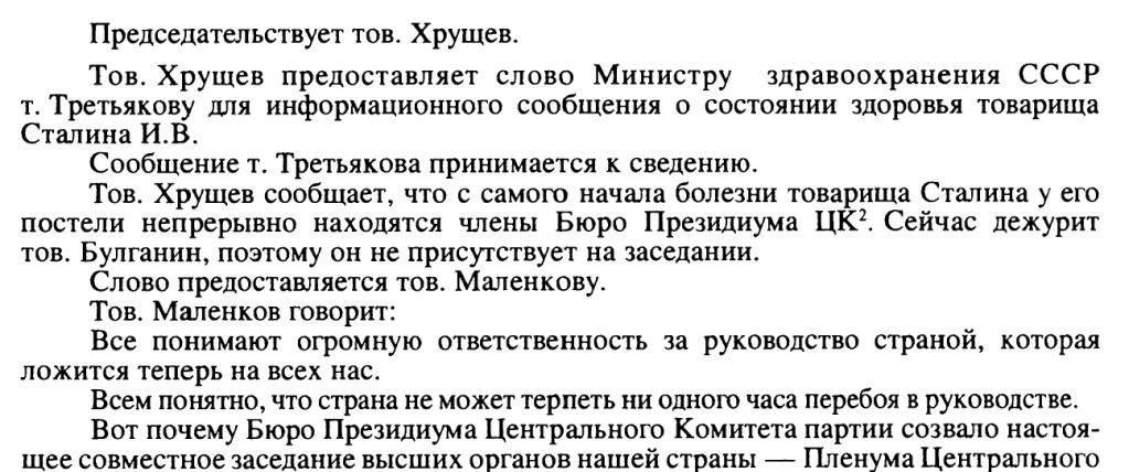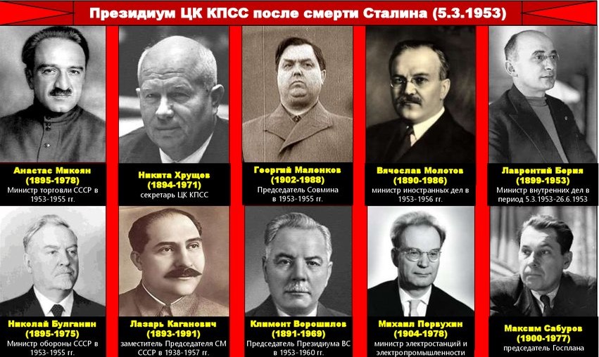 Όταν μετά από δύο μέρες θα ανακοινωθούν οι αποφάσεις της κοινής συνεδρίασης της Ολομέλειας της Κεντρικής Επιτροπής του ΚΚΣΕ, του Υπουργικού Συμβουλίου και του Πρεζίντιουμ του Ανωτάτου Σοβιέτ, όποιος διαβάσει τα απομνημονεύματα του Χρουστσόφ θα μείνει με την εντύπωση ότι όλα έγιναν όπως έπρεπε: πεθαίνει ο Στάλιν, συγκαλείται το Πρεζίντιουμ για να προτείνει και τα ανώτατα όργανα συνεδριάζουν την επομένη (6η Μάρτη) και αποφασίζουν. Στην πραγματικότητα οι «τριανδρία» (Μπέρια, Μαλενκόφ, Χρουστσόφ) επιβάλλει, ελέγχοντας τα υπόλοιπα μέλη του Γραφείου, και αγνοώντας τα υπόλοιπα μέλη του Πρεζίντιουμ, την διανομή των νέων ρόλων, πριν ο παραγωγός-σκηνοθέτης-πρωταγωνιστής, Στάλιν παραδώσει το πνεύμα του στην Ιστορία.