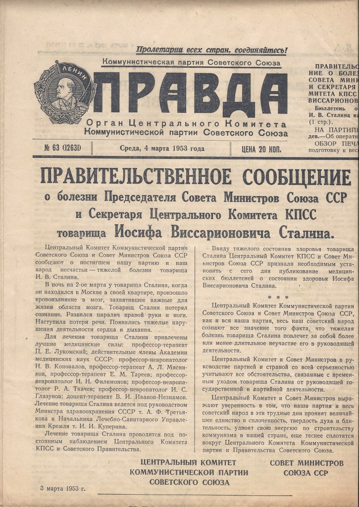 20. Ιατρικό Ανακοινωθέν, 2 π.μ., 4 Μαρτίου 1953, στο φ. της Πράβντα 4 Μαρτίου 1953, σ. 1