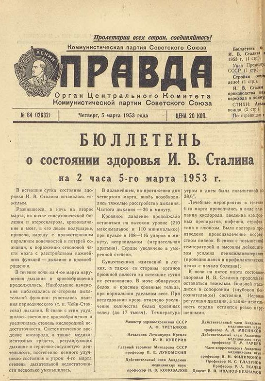 23. Ιατρικό Ανακοινωθέν, 2 π.μ., 5 Μαρτίου 1953, στο φ. της Πράβντα 5 Μαρτίου 1953, σ. 1