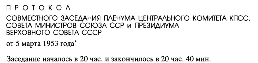 Στις 08:00 το βράδυ της 5ης Μαρτίου στην «Αίθουσα Σβερτλόφ» του Κρεμλίνου ξεκινά η ασυνήθιστη κοινή συνεδρίαση της Ολομέλειας της Κεντρικής Επιτροπής του ΚΚΣΕ, των μελών του Υπουργικού Συμβουλίου και του Πρεζίντιουμ του Ανωτάτου Σοβιέτ.