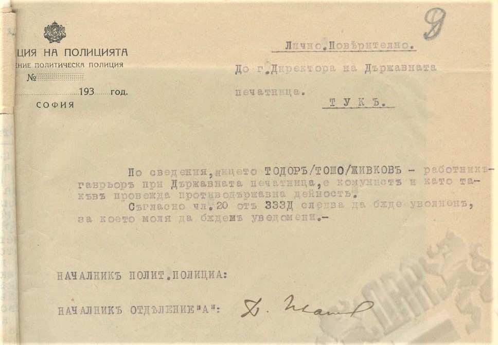 Με βάση ένα έγγραφο που βρέθηκε, στα αρχεία της Κρατικής Ασφάλειας, στο φάκελο του Ζίβκοφ, στα τέλη του 1933, ο επικεφαλής του Α’ Τμήματος (δίωξη κομμουνιστών) της Πολιτικής Αστυνομίας (Κρατική Ασφάλεια) διαβαθμισμένα ανακοινώνει στο διευθυντή του Κρατικού Τυπογραφείου ότι ο Ζίβκοφ είναι κομμουνιστής και ως τέτοιος ασκεί αντικρατική δραστηριότητα και βάσει του άρθρου 20 του νόμου «Περί Προστασίας του Κράτους» θα πρέπει να απολυθεί. Όπως είναι αναμενόμενο ο διευθυντής υπακούει και τον απολύει. Εδώ εγείρονται σοβαρές αμφιβολίες για την αυθεντικότητα του εγγράφου αυτού, γιατί δεν έχει ημερομηνία, σφραγίδα και υπογραφή του επικεφαλής της Πολιτικής Αστυνομίας.