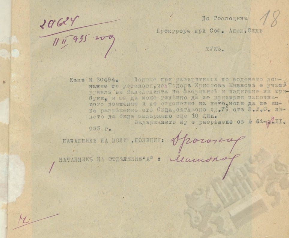 Στην αίτηση παράτασης της κράτησης, που έχει πρωτοκολληθεί με αριθμό πρωτοκόλλου № 20624 στις 11 Φεβρουαρίου 1935, διαβάζουμε ότι ο Ζίβκοφ κρατείται από τις 4 του Φλεβάρη 1935. Ο επικεφαλής της Πολιτικής Αστυνομίας Драганов, αιτιολογεί την αίτηση παράτασης της κράτησης ως εξής: «Καθώς οι αποκαλύψεις της ανάκρισης έδειξαν ότι και ο Τόντορ Χρίστοφ Ζίβκοφ είχε συμμετάσχει στις επιθέσεις στα εργοστάσια και στην ογάνωση ομιλιών, και για να ολοκληρωθεί με επιτυχία η ανάκριση, θα ήθελα να δοθεί άδεια από το δικαστήριο για την κράτηση του ατόμου για άλλες 10 ημέρες.»