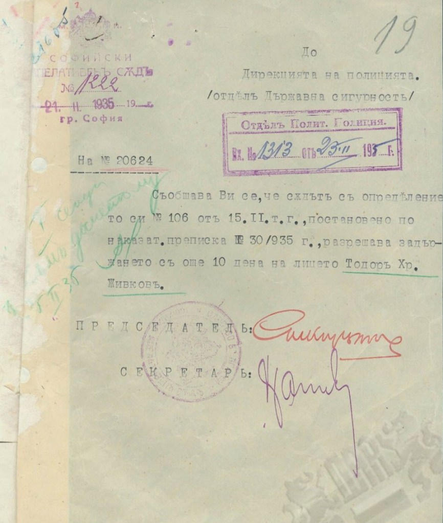 Πηγή: Тодор Живков. Полицейско досие. Решение на съда. 21.02.1935, Ф. 2124 К; оп. 1; а.е. 10515 Б, http://policefiles.archives.bg/dosieta/2013-01-23-11-14-23/513-2013-01-23-11-20-42