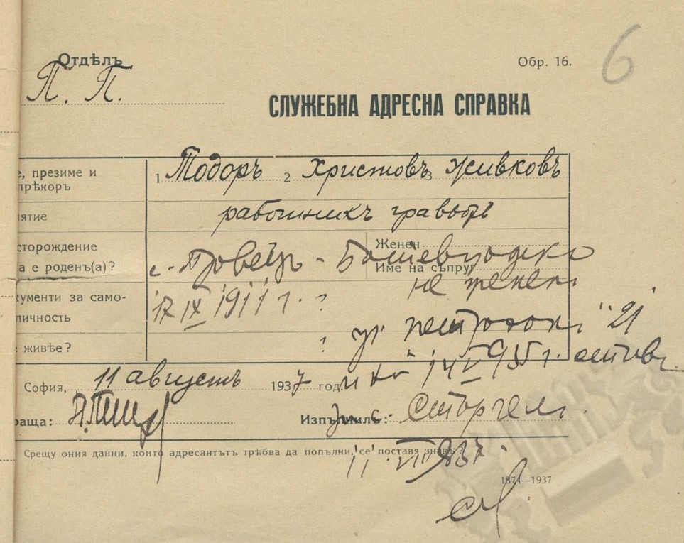 Πηγή: Тодор Живков. Полицейско досие. Искане за задържане. 11.02.1935, Ф. 2124 К; оп. 1; а.е. 10515 Б, http://policefiles.archives.bg/dosieta/2013-01-23-11-14-23/513-2013-01-23-11-20-42