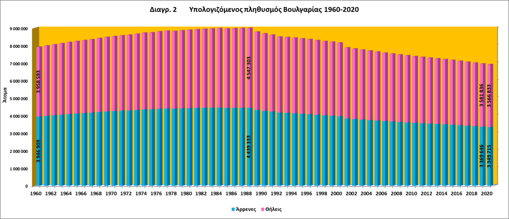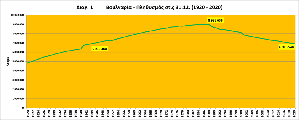 Στις 12/4/2021, το Εθνικό Στατιστικό Ινστιτούτο (ΕΣΙ) της Βουλγαρίας, παρουσίασε τα ετήσια δημογραφικά στοιχεία για το 2020. Σύμφωνα με το ΕΣΙ, ο υπολογιζόμενος πληθυσμός της Βουλγαρίας, στις 31.12.2020, ανέρχεται σε 6 916 548 άτομα. Περίπου όσο ήταν και πριν από 76 χρόνια, το 1944 (6 913 300 άτομα). Εάν παρατηρήσουμε (βλ. διαγ. 1) την ετήσια πληθυσμιακή μεταβολή των τελευταίων εκατό ετών (1920 – 2020) θα διαπιστώσουμε ότι τα πρώτα 68 χρόνια, μέχρι δηλαδή και το 1988, αυτή είναι αυξητική, με εξαίρεση τρεις χρονιές (1951, 1978 και 1985), όπου καταγράφεται ετήσια μείωση, σε σχέση με το προηγούμενο έτος. Το 1988, η Βουλγαρία έφτασε πολύ κοντά στο όριο των 9 εκατομμυρίων κατοίκων (8 986 636 άτομα), αλλά από τότε ακολουθεί αντίθετη πορεία. Ο πληθυσμός της Βουλγαρίας τα τελευταία 32 χρόνια μειώνεται κάθε χρόνο.