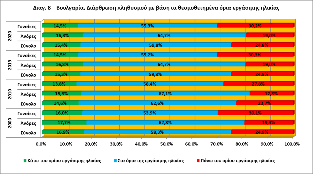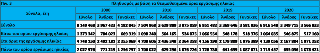 Στα πληθυσμιακά σύνολα που βρίσκονται ανάμεσα στα όρια της εργασιακής ηλικίας και πάνω από αυτά, επιδρούν και οι νομοθετικές αλλαγές κατά τον καθορισμό των ηλικιακών ορίων συνταξιοδότησης. Έτσι στο πίνακα 3 και στο διάγραμμα 8, το 2000, τα θεσμοθετημένα όρια για τις γυναίκες ήταν από το 16ο έτος μέχρι το 55ο έτος και 6 μήνες, ενώ για τους άνδρες από το 16ο έτος μέχρι το 60ο έτος και 6 μήνες. Σταδιακά η εργασιακή ηλικία μεγαλώνει προς τα πάνω: Το 2010 τα όρια έχουν διευρυνθεί, στις γυναίκες από 16 έως 60 ετών και στους άνδρες από 16 έως 63 ετών. Το 2019 στις γυναίκες από 16 έως 61 ετών και 4 μήνες και στους άνδρες από 16 έως 64 ετών και 2 μήνες και το 2020 στις γυναίκες από 16 έως 61 ετών και 6 μήνες και στους άνδρες από 16 έως 64 ετών και 3 μήνες5.