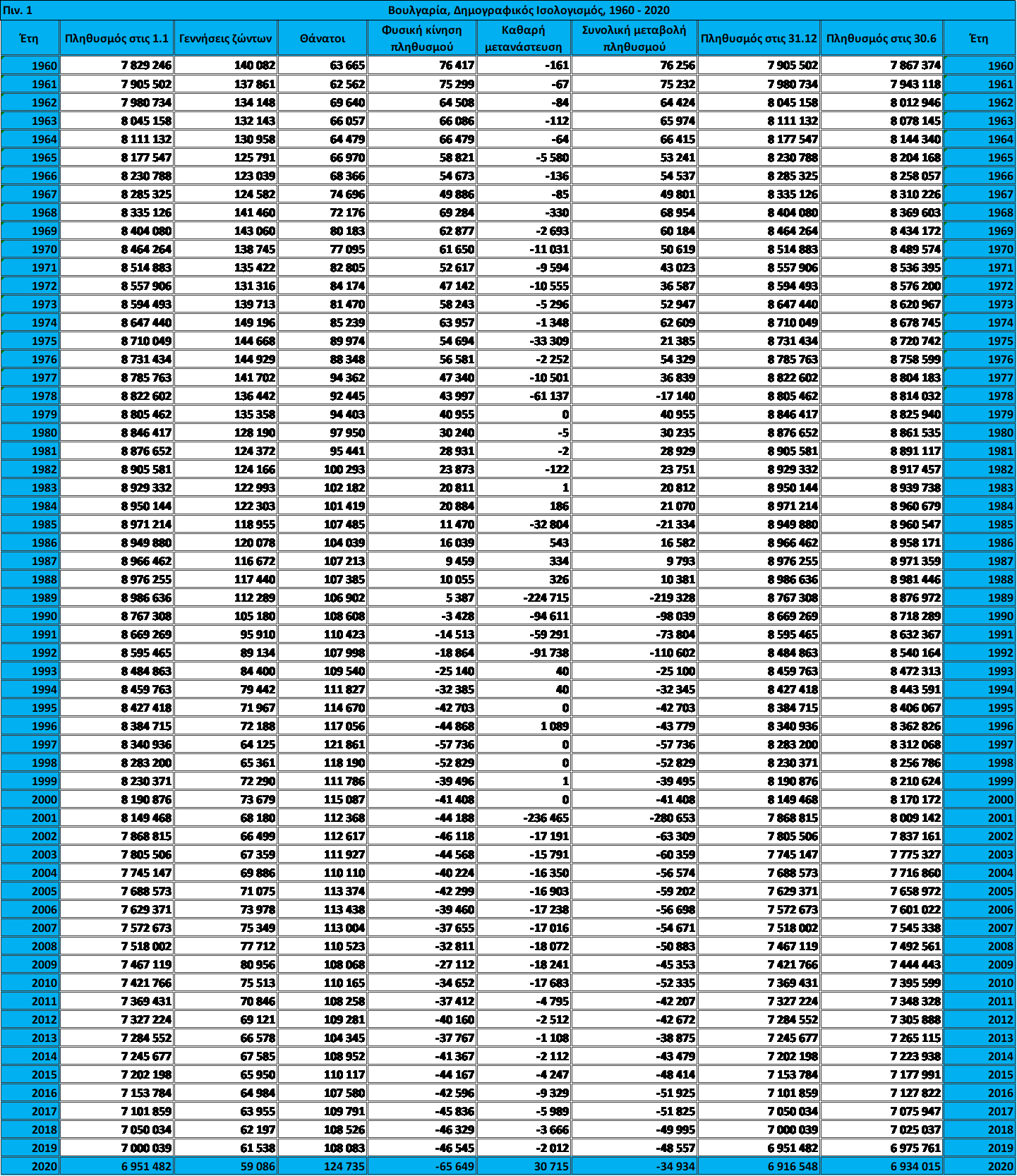 Σε σχέση με την 31η Δεκεμβρίου 2019, ο πληθυσμός της χώρας ένα χρόνο μετά, στις 31.12.2020, μειώθηκε κατά 34 934 άτομα, ή κατά 0,5%, ως αποτέλεσμα της φυσικής μείωσης1 του πληθυσμού κατά 65 649 άτομα, και της θετικής καθαρής μετανάστευσης2 κατά 30 715 άτομα. Πιο συγκεκριμένα η φυσική κίνηση του πληθυσμού το 2020, ήταν αρνητική, μιας και οι θάνατοι (124 735 άτομα) ήταν περισσότεροι από τον αριθμό των καταγεγραμμένων γεννήσεων ζώντων (59 086 άτομα). Το 2020 η καθαρή μετανάστευση ήταν θετική, εφόσον οι μεταναστευτικές εισροές, ανέρχονταν σε 37 364 άτομα και οι μεταναστευτικές εκροές σε 6 649 άτομα (βλ. πιν.1).
