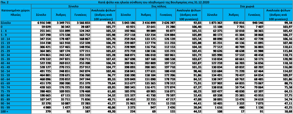 Στις 31.12.2020 ο υπολογιζόμενος ανδρικός πληθυσμός της Βουλγαρίας ανέρχεται σε 3 349 715 άτομα (48,4%), ενώ ο γυναικείος σε 3 566 833 άτομα (51,6%). Από την τιμή του λόγου των φύλων προκύπτει ότι το 2020 η αναλογία ανδρών: γυναικών είναι 93,91:100, δηλαδή σε 100 γυναίκες αντιστοιχούν 93,91 άνδρες3 (βλ. πιν.2). Το 2019 η αναλογία ανδρών – γυναικών ήταν 94,08 προς 100.