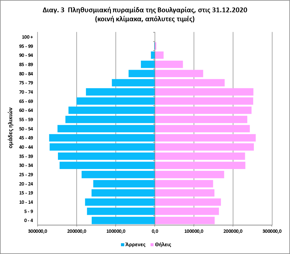 Η πληθυσμιακή πυραμίδα4 της Βουλγαρίας στις 31.12.2020 εκφράζει έναν πληθυσμό που βρίσκεται σε διαδικασία δημογραφικής γήρανσης: στενή στη βάση και πεπλατυσμένη στο μέσον και σταδιακά στην κορυφή της.