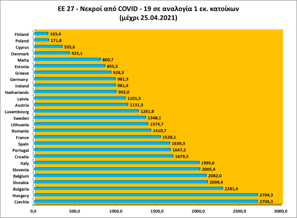 Πηγή: στοιχεία για τον πληθυσμό από την EUROSTAT, http://appsso.eurostat.ec.europa.eu/nui/submitViewTableAction.do, τελευταία ενημέρωση 11 Μαρτίου 2021 και για τα θύματα από CONVID – 19 https://www.svobodnaevropa.bg/a/30502778.html, τελευταία ενημέρωση 25 Απρίλη, 2021 9:50 GMT
