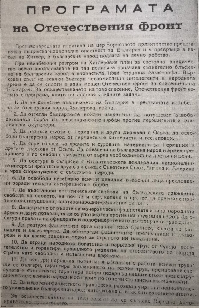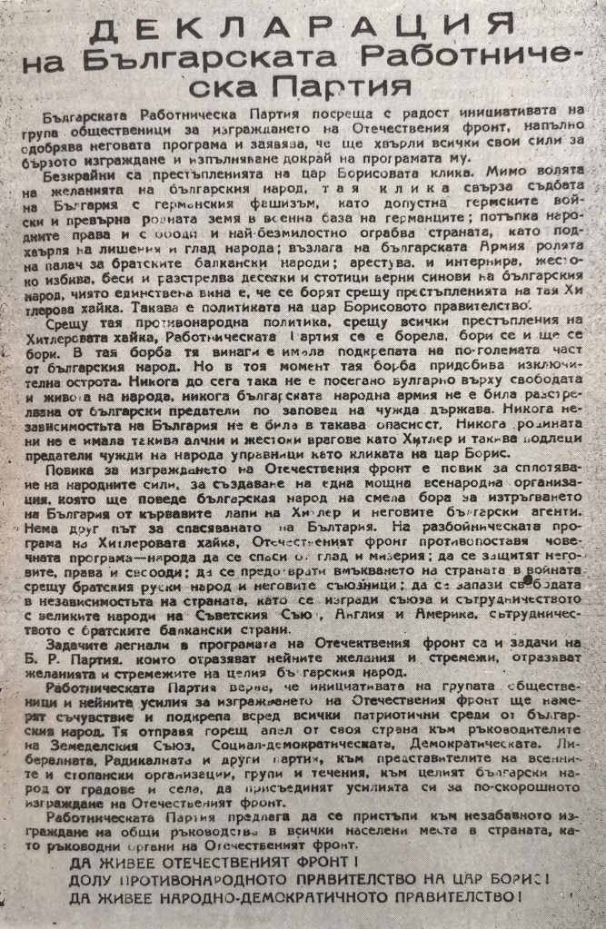 Στη βάση των κατευθύνσεων του Ντιμίτροφ, την επεξεργασία της πολιτικής πλατφόρμας του Πατριωτικού Μετώπου (ΠΜ) αναλαμβάνει ο Β. Κολάροφ. Το κείμενο αφού διορθώθηκε από τον Ντιμίτροφ και εγκρίθηκε από το ΓΕ, στις 17 Ιουλίου 1942, διαβάστηκε από τον Карло Луканов, από τη συχνότητα του ραδιοσταθμού «Христо Ботев».
