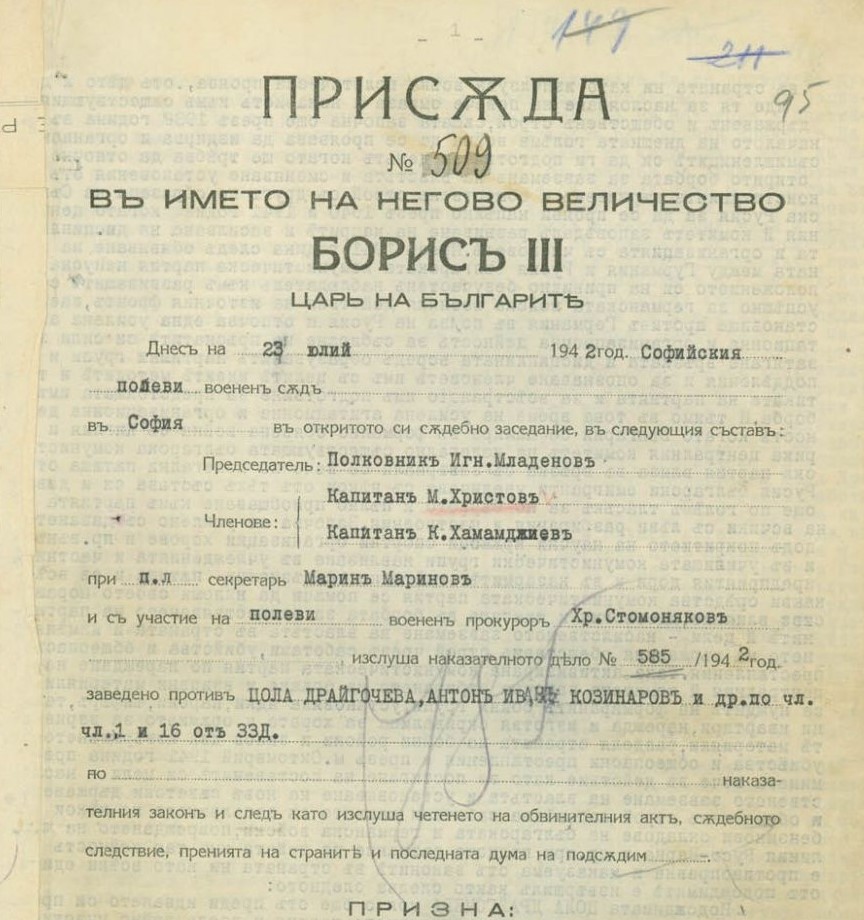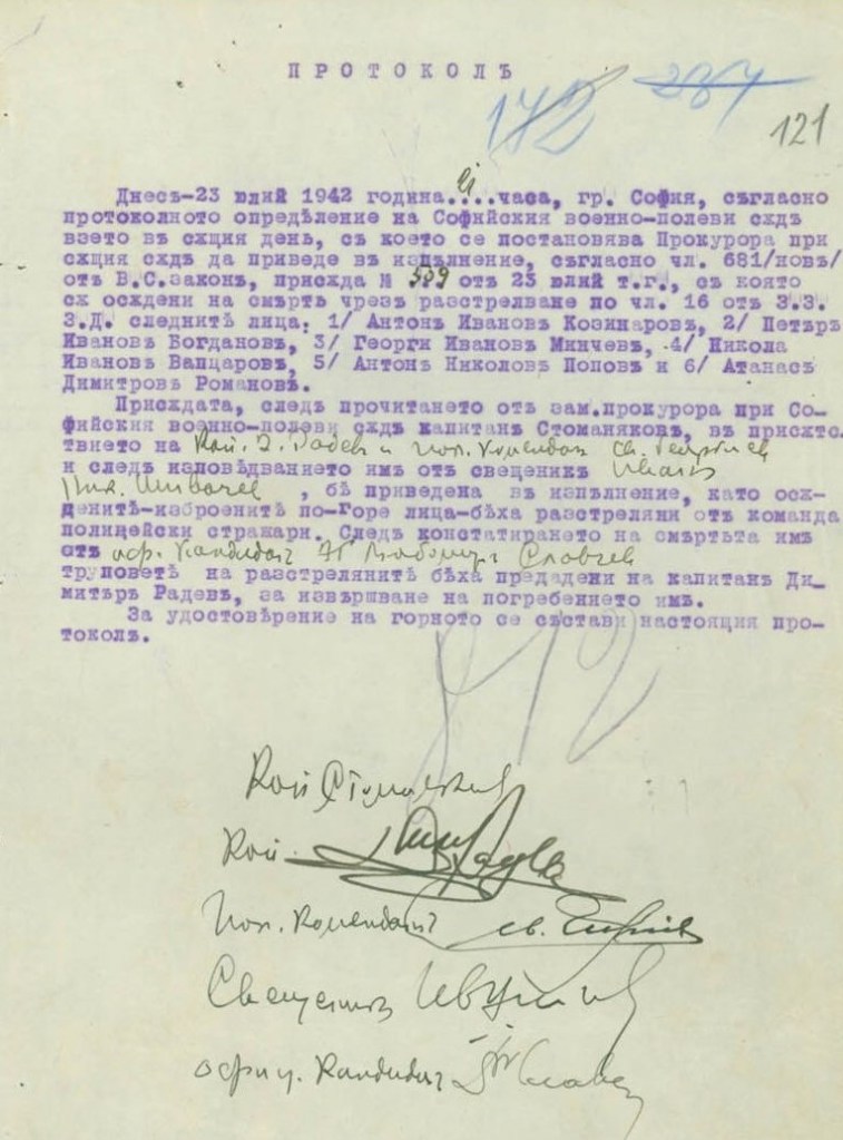 Στις 23 Ιουλίου 1942, θα εκδοθεί η απόφαση του δικαστηρίου: 12 θανατικές καταδίκες, από τις οποίες οι 6 ερήμην (Цола Драгойчева, Борис Копчев, Христо Михайлов, Антон Югов, Дико Диков, Аврам Стоянов). Την ίδια μέρα θα εκτελεστούν δια τουφεκισμού στο σκοπευτήριο της Σχολής εφέδρων αξιωματικών οι: Антон Иванов, Антон Попов, Атанас Романов, Петър Богданов, Никола Вапцаров και Георги Минчев. Επίσης 6 άτομα θα καταδικαστούν σε ισόβια κάθειρξη στην απομόνωση. Ανάμεσά τους και ο νούμερο δύο του Κόμματος, ο Πολιτικός Γραμματέας της ΚΕ, Трайчо Костов, ο οποίος την τελευταία στιγμή γλίτωσε από την θανατική καταδίκη, μετά από παρέμβαση του συμβούλου και γραμματέα του τσάρου Μπορίς Γ’, του Станислав Балан, ο οποίος παρακάλεσε τον τσάρο να μην απαγγελθεί θανατική ποινή στον παλιό του συμμαθητή29.