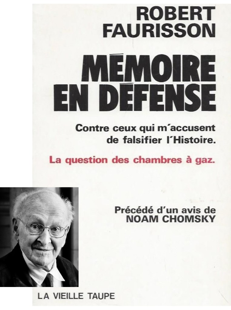 Ο Τσόμσκι διαβάζοντας την τοποθέτηση του Βιντάλ-Νακέ, αλλά και μια επιστολή που του είχε στείλει στην οποία ανέφερε αυτές που θεωρούσε αποδείξεις του αντισημιτισμού του Φωρισσόν, αποδέχεται την πρόταση του κοινωνιολόγου Σερζ Τιόν, φίλο του εκείνη την εποχή, να υπερασπιστεί τον εαυτό του διατυπώνοντας γραπτώς τις θέσεις του. Ο Αμερικανός διανοητής ετοίμασε λοιπόν ένα κείμενο στις 11 Οκτωβρίου, με τίτλο «Μερικά στοιχειώδη σχόλια πάνω στο δικαίωμα της ελευθερίας της έκφρασης»38, το οποίο έστειλε στον Τιόν, επιτρέποντάς του να το χρησιμοποιήσει όπως εκείνος θα ήθελε. Από όσα πιστεύουμε ότι γνωρίζουμε, χωρίς να τον ειδοποιήσουν, ο Τιόν και ο εκδότης Πιέρ Γκιγιόμ (Pierre Guillaume) εμφανίζουν αυτό το κείμενο – άποψη, σαν πρόλογο του συγγράμματος του Φωρισσόν «Υπερασπιστικό υπόμνημα εναντίον αυτών που με κατηγορούν ότι παραχαράσσω την Ιστορία. Το θέμα των θαλάμων αερίων». Ο ίδιος ο Τσόμσκι ρητά δηλώνει ότι «Ποτέ δεν έγραψα κανένα πρόλογο σε οποιοδήποτε σύγγραμμα του Ρομπέρ Φωρισσόν»39. Για να δικαιολογήσει όμως την πρωτοβουλία του Τιόν, σε άρθρο του στο εβδομαδιαίο περιοδικό The Nation στις 28 Φεβρουαρίου 1981 σημειώνει ότι: «Αν και δεν ήταν αυτή η πρόθεσή μου, δεν ήταν αντίθετη με τις οδηγίες μου»40. Ο Τσόμσκι αναφέρει ότι: έλαβε ένα γράμμα από τον Jean-Pierre Faye, έναν γνωστό αντιφασίστα συγγραφέα και αγωνιστή, ο οποίος αν και συμφωνούσε με τη θέση του, τον παρότρυνε να μην δημοσιεύσει τη δήλωσή του «επειδή το κλίμα κοινής γνώμης στη Γαλλία ήταν τέτοιο που υπερασπιζόμενος το δικαίωμα του Faurisson να εκφράζει τις απόψεις του θα ερμηνεύονταν ως στήριξή τους»41. Αυτό σημαίνει ότι ο Jean-Pierre Faye ήξερε την ύπαρξη του κειμένου και του περιεχομένου του. Στις 6 Δεκεμβρίου ο Τσόμσκι γράφει στον Τιόν: «Εάν το κείμενο δεν έχει σταλθεί στο τυπογραφείο, απαιτώ να μην συμπεριληφθεί στο βιβλίο του Φωρισσόν». Όμως είναι πολύ αργά. Το βιβλίο του Φωρισσόν με τον πρόλογο του Τσόμσκι είχε ήδη τυπωθεί από τις εκδόσεις La Vieille Taupe42.