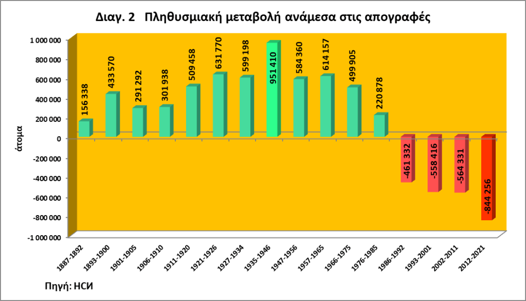 Η φυσική μεταβολή για την περίοδο 2011 – 2021, είναι αρνητική κατά 448 χιλιάδες άτομα, ή 53% από την συνολική μείωση του πληθυσμού. Το υπόλοιπο 47% της μείωσης οφείλεται στην καθαρή μετανάστευση ανάμεσα στις δύο απογραφές.
