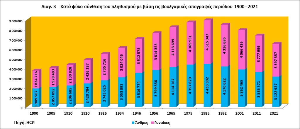 Με βάση την προκαταρκτική εκτίμηση της απογραφής του 2021, ο ανδρικός πληθυσμός ανέρχεται σε 3 122 957 άτομα (47,9%), ενώ ο γυναικείος σε 3 397 357 άτομα (52,1%). Από την τιμή του λόγου των φύλων προκύπτει ότι το 2021 η αναλογία ανδρών: γυναικών είναι 91,92:100, δηλαδή σε 100 γυναίκες αντιστοιχούν 91,92 άνδρες.