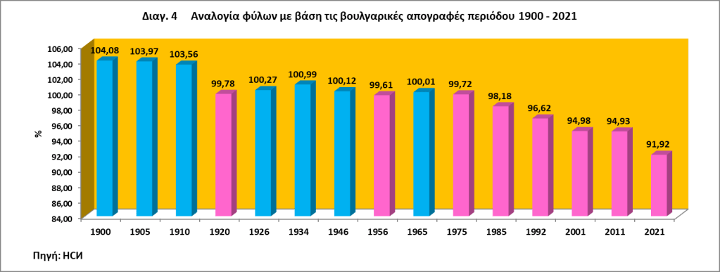 Ο λόγος των φύλων είναι ιδιαίτερα ευαίσθητος στην ηλικιακή δομή του πληθυσμού ακολουθώντας σε γενικές γραμμές τον κανόνα ότι σε νεότερες ηλικίες η αναλογία των ανδρών μέσα σε αυτόν, είναι υψηλότερη, ενώ σε μεγαλύτερες ηλικίες, η αναλογία των γυναικών, είναι υψηλότερη. Αυτό οφείλεται στη διαπίστωση ότι κάθε ένα από τα δημογραφικά φαινόμενα (γεννητικότητα, θνησιμότητα και μεταναστευτική κίνηση) επιδρά με διαφορετικό τρόπο στη σύνθεση του πληθυσμού διαταράσσοντας την αριθμητική ισορροπία πότε προς όφελος του ενός και πότε του άλλου φύλου. Η γεννητικότητα φαίνεται να ευνοεί τα αγόρια ενώ αντίθετα η θνησιμότητα επιδρά προς όφελος των γυναικών. Το διάγραμμα 4 αποτυπώνει τη μακροχρόνια τάση της αναλογίας ανδρών/γυναικών η οποία τις τελευταίες 6 απογραφές είναι σταθερά και με αυξητικούς ρυθμούς υπέρ του γυναικείου φύλου.