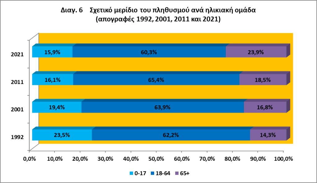 Η κατανομή του πληθυσμού ανά ηλικιακές ομάδες δείχνει μια εμβάθυνση της διαδικασίας γήρανσης. Το ποσοστό των ατόμων ηλικίας 65 ετών και άνω αυξήθηκε κατά 5,4 ποσοστιαίες μονάδες σε σύγκριση με το 2011 και κατά 9,6 ποσοστιαίες μονάδες σε σύγκριση με το 1992.