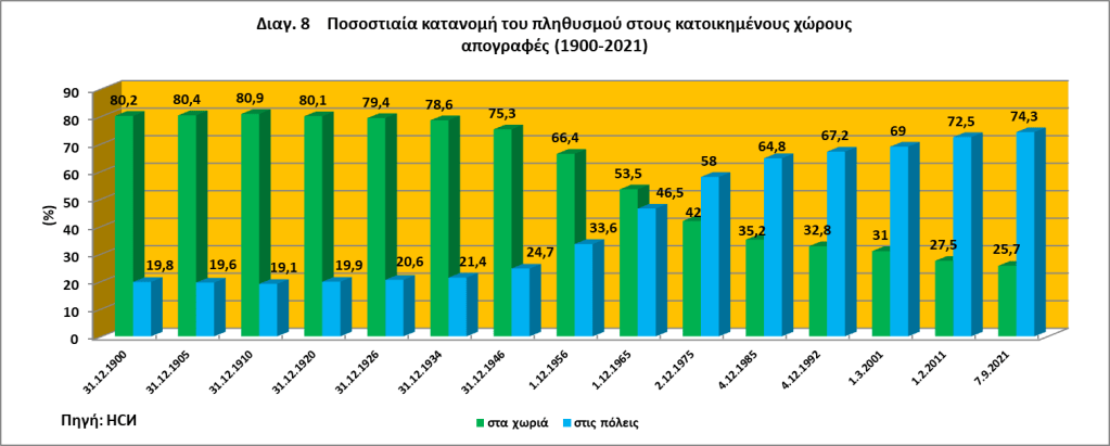 Στις τελευταίες τέσσερις απογραφές ενώ καταγράφεται μείωση του συνολικού πληθυσμού, η ποσοστιαία μείωση του αστικού πληθυσμού είναι μικρότερη, με αποτέλεσμα να συνεχίζει να αυξάνεται το μερίδιο του αστικού πληθυσμού (βλ. διαγ. 8). Την περίοδο 1986-2021 καταγράφεται μείωση του συνολικού πληθυσμού σε απόλυτους αριθμούς κατά 2 428 335 άτομα από τα οποία τα 954 131 είναι κάτοικοι πόλεων (39%) και 1 474 204 άτομα (61%) κάτοικοι χωριών.