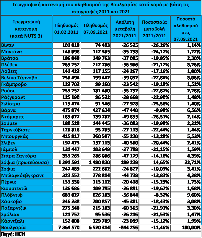 Σε σχέση με την γεωγραφική κατανομή του πληθυσμού, τα στοιχεία των απογραφών 2011 και 2021 δείχνουν ότι, μόνο σε ένα νομό παρατηρείται αύξηση του πληθυσμού: στον νομό Σόφιας (πρωτ.) κατά 189 239 άτομα (14,65%). Την μεγαλύτερη ποσοστιαία μείωση του πληθυσμού, κατέγραψαν ο νομός Ντόμπριτς (-26,31%), ο νομός Βίντιν (-26,26%) και ο νομός Μοντάνα (-24,17%). Την μικρότερη ποσοστιαία μείωση κατέγραψαν οι νομοί: Πλόβντιφ (-8,32%), Βάρνας (-9,99) και Σόφιας-εκτός πρωτ. (-10,03%). Με βάση τα προκαταρκτικά στοιχεία της τελευταίας απογραφής, ο μεγαλύτερος πληθυσμιακά νομός συνεχίζει να είναι ο νομός Σόφιας (πρωτ.), στον οποίο ο συνήθως διαμένων πληθυσμός ανέρχεται στα 1 480 830 άτομα ή 22,71% του συνολικού πληθυσμού. Ακολουθεί ο νομός Πλόβντιφ με 626 183 άτομα (9,6%), ο νομός Βάρνας με 427 634 (6,56%) και ο νομός Μπουργκάς με 360 587 άτομα (5,53%). Άρα σε αυτούς τους 4 νομούς ζει το 44,4% του συνολικού πληθυσμού της χώρας. Ο μικρότερος πληθυσμιακά νομός συνεχίζει να είναι ο νομός Βίντιν με 74 493 κατοίκους (1,14%).
