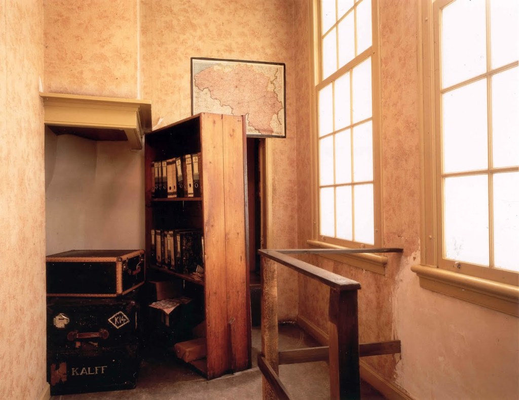 Ο Κούγκλερ υπακούει. Τι άλλο μπορεί να κάνει; Οι ασφαλίτες τον ακολουθούν με τα πιστόλια βγαλμένα. Καθώς προχωρά στον διάδρομο συνεχίζει να διερωτάται: Αυτοί οι άνδρες απλώς μπλοφάρουν ή μήπως έχουν πάρει πραγματικά μια πληροφορία; Κάποιος τους έχει καρφώσει; Ένας γείτονας; Ένας υπάλληλος; Μετά από λίγα βήματα έφτασε στην ξύλινη περιστρεφόμενη σκάλα6. Ένα ένα ανεβαίνει τα στενά σκαλιά, ενώ οι αστυνομικοί είναι στο κατόπι του. Δεκατέσσερα, δεκαπέντε, δεκαέξι. Τώρα στέκονται σε έναν διάδρομο, του οποίου η μπεζ-κόκκινη ταπετσαρία με λουλούδια τον κάνει να φαίνεται ακόμα πιο στενός από ό,τι είναι. Πίσω τους είναι η πόρτα για την αποθήκη μπαχαρικών, μπροστά τους μια ψηλή βιβλιοθήκη με τρία ράφια γεμάτα με φθαρμένους γκρίζους φακέλους αρχείων. Πάνω από τη βιβλιοθήκη κρέμεται ένας μεγάλος χάρτης του είδους που βλέπουμε σε κυβερνητικά γραφεία ή σχολεία: το Βέλγιο, σε κλίμακα 1:500.000.