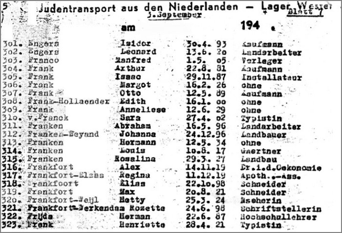 Η Rootje de Winter αργότερα ανέφερε: «Ο Μένγκελε με έστειλε με τους ηλικιωμένους και τους άρρωστους. Μετά ήρθε η κυρία Φρανκ – και αυτή, επίσης, στάλθηκε να ενταχθεί στην ομάδα μας. “Επόμενος” φώναξε. Η Άννα και η Μαργκότ προχώρησαν μπροστά. Ήταν ακόμα σε ελεεινή κατάσταση από την ψώρα, αλλά ήταν και οι δύο νέες … “Στα αριστερά!” φώναξε ο Μένγκελε και η Άννα και η Μαργκότ προχώρησαν. Τότε ακούστηκε η θυμωμένη κραυγή της Έντιθ Φρανκ: “Τα παιδιά! Θεέ μου τα παιδιά…!”»45.