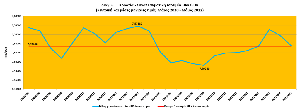 Όπως μπορούμε να δούμε από το διάγραμμα 6, κατά τη διετή περίοδο αναφοράς, από τις 26 Μαΐου 2020 μέχρι τις 25 Μαΐου 2022, η συναλλαγματική ισοτιμία HRK/EUR παρουσίασε χαμηλό βαθμό μεταβλητότητας (μικρότερη από ±0,6%) και διαμορφώθηκε πλησίον της κεντρικής ισοτιμίας της. Την ίδια περίοδο η συναλλαγματική ισοτιμία BGN/EUR παρέμεινε σταθερή (±0%) στην κεντρική της ισοτιμία.