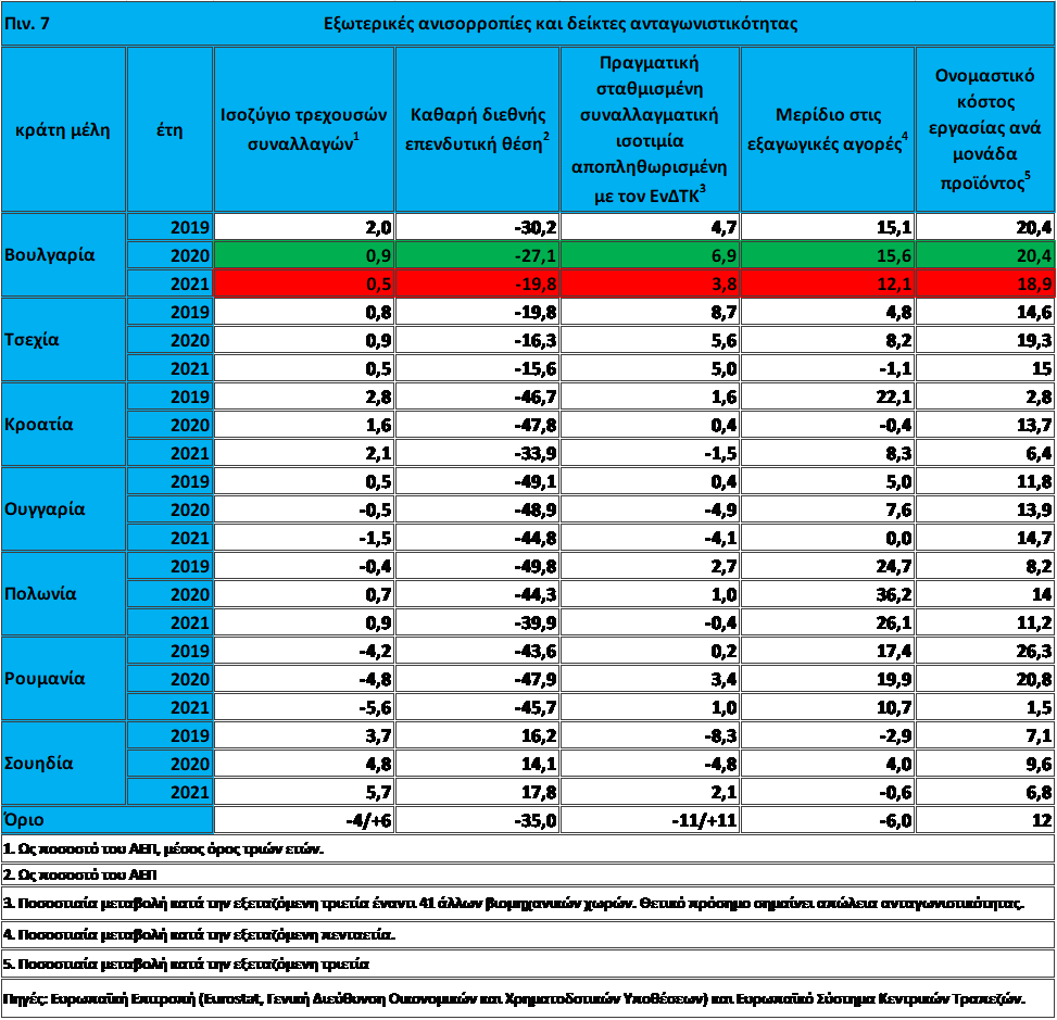 Όσον αφορά την ανταγωνιστικότητα τιμών και κόστους, μεταξύ 2019 και 2021 οι πραγματικές συναλλαγματικές ισοτιμίες αποπληθωρισμένες με τον ΕνΔΤΚ ανατιμήθηκαν σε διαφορετικούς βαθμούς στις περισσότερες από τις εξεταζόμενες χώρες. Ο τριετής ρυθμός αύξησης του κόστους εργασίας ανά μονάδα προϊόντος, ο οποίος τα χρόνια πριν από την πανδημία του COVID-19 βρισκόταν σε πολύ υψηλά επίπεδα σχεδόν σε όλες τις υπό εξέταση χώρες, μειώθηκε αλλά υπερέβη το ενδεικτικό όριο του 12% στη Βουλγαρία, την Τσεχία και την Ουγγαρία. Κατά την πενταετία από το 2016 έως το 2021, καταγράφηκαν κέρδη στα μερίδια της εξαγωγικής αγοράς στην πλειονότητα των χωρών (βλ. πιν. 7).