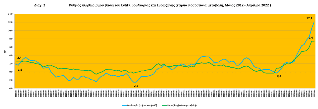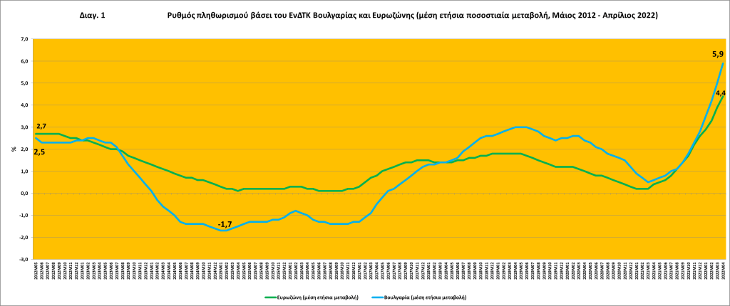 Τον Απρίλιο του 2022 ο μέσος δωδεκάμηνος ρυθμός πληθωρισμού βάσει του ΕνΔΤΚ στη Βουλγαρία ήταν 5,9%, δηλαδή πάνω από την τιμή αναφοράς του 4,9% για το κριτήριο της σταθερότητας των τιμών (βλ. πιν.1 και πιν. 2).