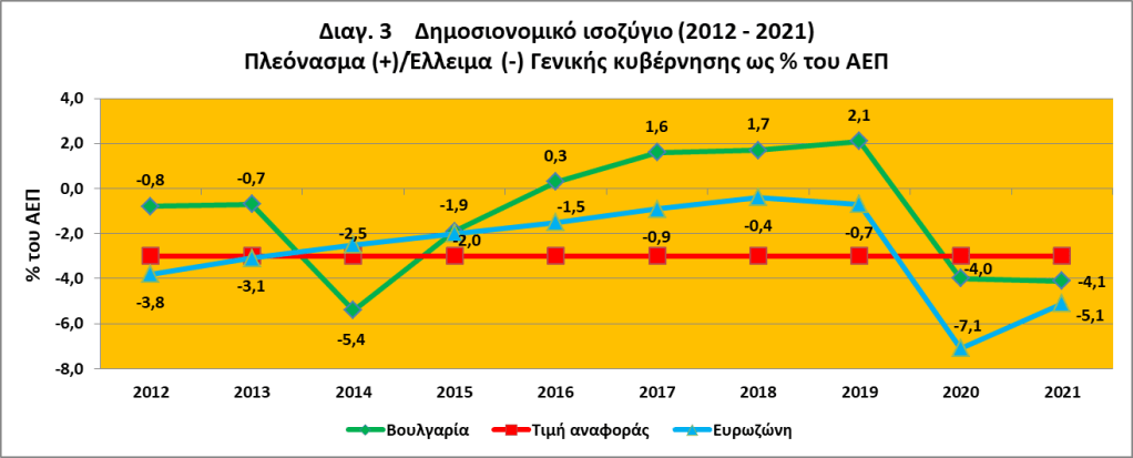 Το έτος αναφοράς 2021, ο προϋπολογισμός της γενικής κυβέρνησης της Βουλγαρίας κατέγραψε έλλειμμα 4,1% του ΑΕΠ, πάνω από την τιμή αναφοράς του ελλείμματος 3%. Ο λόγος του ακαθάριστου χρέους της γενικής κυβέρνησης προς το ΑΕΠ ήταν 25,1%, πολύ κάτω από την τιμή αναφοράς του 60% (βλ. πιν. 1 και διαγ. 3 και 4). Σε σύγκριση με το προηγούμενο έτος, το έλλειμμα της γενικής κυβέρνησης αυξήθηκε κατά 0,1 ποσοστιαίες μονάδες και ο δείκτης χρέους αυξήθηκε ελαφρά κατά 0,4 ποσοστιαίες μονάδες. Τα δημοσιονομικά ελλείμματα το 2020 και το 2021 επηρεάστηκαν σημαντικά από τις οικονομικές επιπτώσεις της πανδημίας COVID-19 και τα μέτρα δημοσιονομικής πολιτικής που ελήφθησαν ως απάντηση.