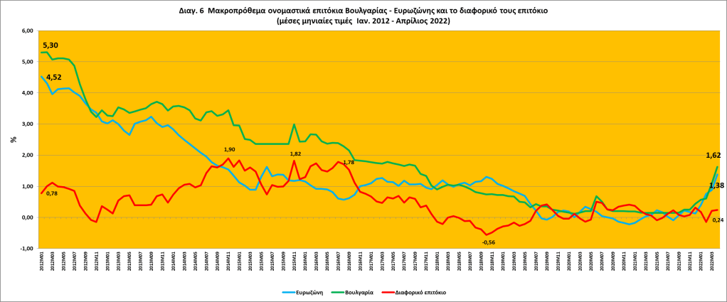 Τα μακροπρόθεσμα επιτόκια στη Βουλγαρία μειώθηκαν από 5,3% τον Ιανουάριο του 2012 σε 1,6% τον Απρίλιο του 2022 (βλ. διαγ. 6).Την τελευταία δεκαετία, οι μακροπρόθεσμες εξελίξεις των επιτοκίων στη Βουλγαρία σύμφωνα με την Έκθεση Σύγκλισης της ΕΚΤ οφείλονται στη σταδιακή συμπίεση των ασφαλίστρων κινδύνου και σε διαρθρωτικούς παράγοντες που συνέβαλαν στη συγκράτηση των προσδοκιών της αγοράς για τα μελλοντικά επιτόκια. Από τον Απρίλιο του 2020, ο αρνητικός αντίκτυπος της πανδημίας COVID-19 στην παγκόσμια και εγχώρια οικονομική δραστηριότητα οδήγησε τα μακροπρόθεσμα επιτόκια στη Βουλγαρία σε ιστορικά χαμηλό επίπεδο 0,1% τον Μάρτιο του 2021, όπου παρέμειναν μέχρι τον Αύγουστο του 2021. Έκτοτε και μέχρι τον Φεβρουάριο του 2022, σε ένα πλαίσιο αυξανόμενου εγχώριου πληθωρισμού, τα μακροπρόθεσμα επιτόκια αυξήθηκαν σταδιακά σύμφωνα με τις εξελίξεις της παγκόσμιας χρηματοπιστωτικής αγοράς, λόγω και της συγκέντρωσης μεγάλου όγκου εκδόσεων κρατικών ομολόγων στην εγχώρια αγορά το τέταρτο τρίμηνο του 2021. Τους δύο τελευταίους μήνες της περιόδου αναφοράς, η αύξηση των μακροπρόθεσμων επιτοκίων ήταν πιο απότομη ως αποτέλεσμα των αυξανόμενων παγκόσμιων και εγχώριων πληθωριστικών πιέσεων. Ως εκ τούτου, τα μακροπρόθεσμα επιτόκια στη Βουλγαρία αυξήθηκαν κατά την εξεταζόμενη περίοδο και διαμορφώθηκαν σε 1,6% τον Απρίλιο του 2022, από 0,2% τον Απρίλιο του 2020 (βλ. διαγ. 6).