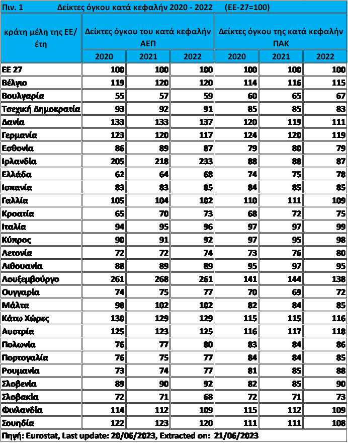 Το 2022, η διασπορά του δείκτη όγκου του κατά κεφαλήν ΑΕΠ στα κράτη μέλη της ΕΕ παραμένει εξαιρετικά εντυπωσιακή. Όπως και τα προηγούμενα έτη, το Λουξεμβούργο κατέγραψε τον υψηλότερο δείκτη, 161 %, πάνω από τον μέσο όρο της ΕΕ. Βέβαια ένα ιδιαίτερο χαρακτηριστικό της λουξεμβουργιανής οικονομίας, που εξηγεί σε κάποιον βαθμό το πολύ υψηλό κατά κεφαλήν ΑΕΠ της χώρας, είναι ότι απασχολεί μεγάλο αριθμό κατοίκων εξωτερικού, οι οποίοι συμβάλλουν στο ΑΕΠ της, αλλά δεν περιλαμβάνονται στον μόνιμο πληθυσμό. Ακολουθούν η Ιρλανδία, η Δανία, οι Κάτω Χώρες, η Αυστρία, η Σουηδία και το Βέλγιο, με δείκτη όγκου του κατά κεφαλήν ΑΕΠ άνω του 20 % πάνω από τον μέσο όρο. Η Γερμανία, η Φινλανδία, η Μάλτα και η Γαλλία είναι τα άλλα κράτη μέλη της ΕΕ με δείκτη άνω του μέσου όρου της ΕΕ. Η Ιταλία, η Σλοβενία, η Κύπρος και η Τσεχία έχουν δείκτες χαμηλότερους από το 10 % του μέσου όρου της ΕΕ. Η Λιθουανία, η Εσθονία, η Ισπανία και η Πολωνία μεταξύ 10 % και 20 % κάτω από τον μέσο όρο της ΕΕ. Ο δείκτης όγκου του κατά κεφαλήν ΑΕΠ της Ουγγαρίας, της Πορτογαλίας, της Ρουμανίας, της Λετονίας και της Κροατίας είναι χαμηλότερο από το 30 % του μέσου όρου. Ακολουθούν με 32% κάτω από τον μέσο όρο της ΕΕ, η Σλοβακία και η Ελλάδα, ενώ για άλλη μια χρονιά η Βουλγαρία καταγράφει με 41% κάτω από τον μέσο όρο της ΕΕ, τον χαμηλότερο δείκτη όγκου του κατά κεφαλήν ΑΕΠ.