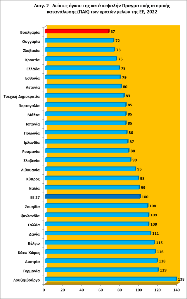 Κατά κανόνα, οι δείκτες όγκου της κατά κεφαλήν ΠΑΚ είναι περισσότερο ομοιόμορφοι από τους δείκτες όγκου του κατά κεφαλήν ΑΕΠ, αλλά εξακολουθούν να υπάρχουν ουσιαστικές διαφορές μεταξύ των κρατών μελών της ΕΕ. Το Λουξεμβούργο, όπως φαίνεται καλύτερα στο διάγραμμα 2, διατηρεί τον υψηλότερο δείκτη όγκου της κατά κεφαλήν ΠΑΚ στην ΕΕ, αλλά «μόλις» με 38 % πάνω από τον μέσο όρο των 27. Το κράτος μέλος της ΕΕ με το δεύτερο μεγαλύτερο δείκτη όγκου του κατά κεφαλήν ΑΕΠ όπως είδαμε είναι η Ιρλανδία, αλλά με βάση τον δείκτη όγκου της κατά κεφαλήν ΠΑΚ βρίσκεται κατά 13% κάτω από τον μέσο όρο της ΕΕ. Όπως και να ‘χει η Βουλγαρία καταλαμβάνει και το 2022 την τελευταία θέση και με βάση τον δείκτη της κατά κεφαλήν ΠΑΚ με 33% κάτω από τον μέσο όρο της ΕΕ των 27 κρατών μελών.