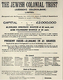 20 Μαρτίου 1899: Στο Λονδίνο ιδρύεται το Εβραϊκό Αποικιακό Καταπίστευμα (JEWISH COLONIAL TRUST – JCT), σύμφωνα με τις αποφάσεις του Πρώτου και του Δεύτερου Σιωνιστικού Συνεδρίου. Πρόκειται ουσιαστικά για την πρώτη σιωνιστική τράπεζα. Ο Τέοντορ Χερτσλ ως εισηγητής αυτής της πρότασης, ήδη στο βιβλίο του «Το Ιουδαϊκό Κράτος», αναφέρεται στην ανάγκη για ένα ισχυρό χρηματοδοτικό μέσο για την πολιτική και οικονομική υλοποίηση του Σιωνισμού. Το μετοχικό κεφάλαιο της JCT ορίστηκε σε δύο εκατομμύρια λίρες στερλίνες. Σύμφωνα με το καταστατικό, η τράπεζα μπορεί να αρχίσει τις δραστηριότητές της μόνο μετά την πώληση μετοχών για το ποσό των 250 χιλιάδων λιρών στερλινών, το οποίο θα εισπραχθεί μόλις στις αρχές του 1902. Ο D. Wolfson, ο οποίος υποστήριξε την ιδέα της ίδρυσης τράπεζας, έγινε ο πρώτος πρόεδρος του διοικητικού συμβουλίου της και παρέμεινε σε αυτή τη θέση μέχρι τον θάνατό του (1914).