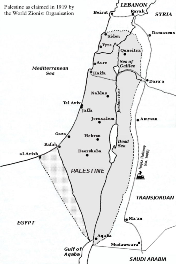 3 Φεβρουαρίου 1919: ΗΠαγκόσμια Σιωνιστική Οργάνωση, υποβάλει τις προτάσεις της σχετικά με την Παλαιστίνη, στη Διάσκεψη Ειρήνης του Παρισιού. Οι προτάσεις αυτές αποτελούν τη βάση για τη βρετανική πρόταση να της δοθεί η Εντολή για την Παλαιστίνη προκειμένου να δημιουργηθεί εκεί μια εβραϊκή εθνική εστία, σε εκπλήρωση της Διακήρυξης του Μπάλφουρ. Οι προτάσεις περιλαμβάνουν σε ειδικό παράρτημα χάρτη με τα γεωγραφικά όρια της Παλαιστίνης, που οραματίζεται η Σιωνιστική Οργάνωση.