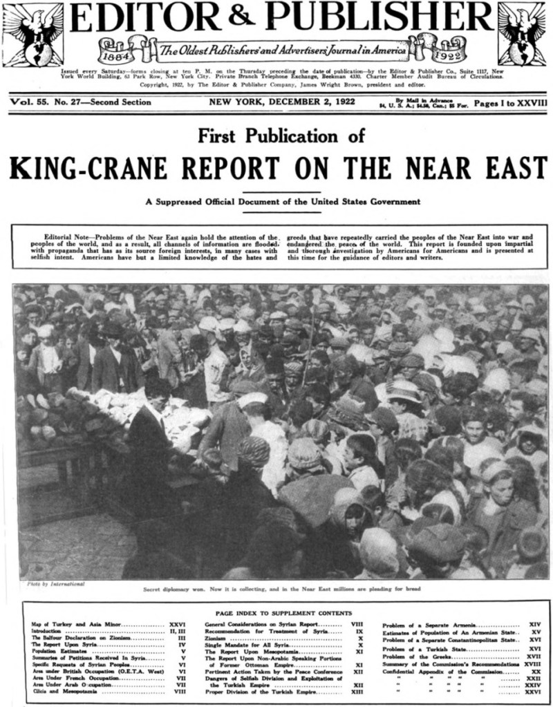 28 Αυγούστου 1919: Σύμφωνα με το πόρισμα της αμερικανικής εξεταστικής επιτροπής Κινγκ-Κρέιν (“King-Crane report on the Near East”), «η εβραϊκή μετανάστευση πρέπει οριστικά να περιοριστεί και το πρόγραμμα μετατροπής της Παλαιστίνης σε εβραϊκή κοινοπολιτεία να εγκαταλειφθεί». Η επιτροπή συνιστά να διατηρηθεί η ενότητα της Συρίας (που περιλαμβάνει τον Λίβανο και την Παλαιστίνη) και η Συρία να τεθεί υπό καθεστώς Εντολής της Κοινωνίας των Εθνών. Η έκθεση θα δημοσιευτεί στις 2 Δεκεμβρίου του 1922.