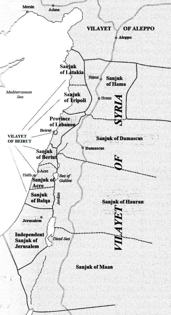 1865: Δημιουργείται το βιλαέτι της Συρίας ή αλλιώς της Δαμασκού. Το σαντζάκι της Ιερουσαλήμ, αν και τυπικά ανήκει στο βιλαέτι της Συρίας, ήδη από το 1841 βρίσκεται υπό την άμεση διοίκηση του παλατιού. Η υπόλοιπη Παλαιστίνη [το σαντζάκι της Άκρα στο βορρά και το σαντζάκι της Μπαλκάα (γύρω από τη Ναμπλούς)] όπως και τα εδάφη της Ιορδανίας, και του Λιβάνου επίσης ανήκουν στο βιλαέτι της Συρίας.