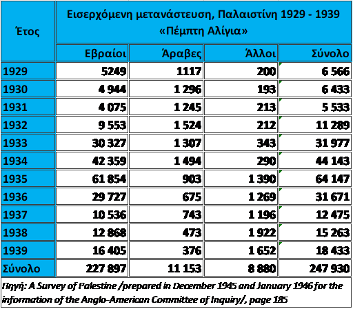 Το 1929 οι εισερχόμενοι μετανάστες στην υπό Βρετανική Εντολή Παλαιστίνη συνολικά είναι 6 566, από τους οποίους οι Εβραίοι είναι 5 249 (80%). Τον επόμενο χρόνο, στην ετήσια «Έκθεση της Κυβέρνησης της Αυτού Μεγαλειότητας του Ηνωμένου Βασιλείου της Μεγάλης Βρετανίας και της Βόρειας Ιρλανδίας προς το Συμβούλιο της Κοινωνίας των Εθνών για τη Διοίκηση της Παλαιστίνης και της Υπεριορδανίας για το έτος 1930» διαβάζουμε: «Στην Παλαιστίνη έγιναν δεκτοί 6 433 μετανάστες, δηλαδή 3 386 άνδρες, 2 116 γυναίκες και 931 παιδιά, εκ των οποίων 2 550 άνδρες, 1 700 γυναίκες και 694 παιδιά ήταν Εβραίοι. Περιλαμβάνονται 695 Εβραίοι, 493 Χριστιανοί, 112 Μουσουλμάνοι και 6 Δρούζοι που είχαν εισέλθει χωρίς άδεια αλλά τους επετράπη να παραμείνουν. Από τους 6 433 μετανάστες, 3 563 προέρχονταν από την Ανατολική Ευρώπη, 1187 από τη Βόρεια Αφρική και τη Δυτική Ασία, συμπεριλαμβανομένων του Ιράκ, της Περσίας και του Αφγανιστάν, 411 από την Κεντρική Ευρώπη, 286 από τις Ηνωμένες Πολιτείες της Αμερικής και 695 από τη Βρετανική Αυτοκρατορία. Απορρίφθηκε η είσοδος σε 213 υποψήφιους μετανάστες που δεν συμμορφώθηκαν με τους Κανονισμούς Μετανάστευσης. Έφυγαν οριστικά από την Παλαιστίνη, 1 432 Παλαιστίνιοι πολίτες, μεταξύ των οποίων 597 Εβραίοι, 368 Χριστιανοί και 467 Μουσουλμάνοι, και 1 571 αλλοδαποί, μεταξύ των οποίων 1 082 Εβραίοι, 430 Χριστιανοί και 59 Μουσουλμάνοι. Μεταξύ των Εβραίων μεταναστών ήταν 1 002 σχετικά πρόσφατες αφίξεις. […] Το 1930 η Ύπατη Αρμοστεία εγκρίνει την είσοδο 2 430 Εβραίων εργαζομένων ανδρών και γυναικών, για τους οποίους η Εβραϊκή Υπηρεσία εγγυήθηκε την απασχόληση.».