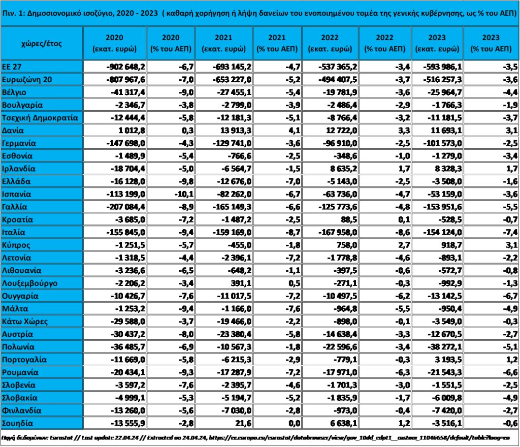 Ο λόγος του δημοσιονομικού ελλείμματος προς το ΑΕΠ της ΕΕ αυξήθηκε από -3,4 % το 2022 σε -3,5 % το 2023, ενώ ο λόγος αυτός μειώθηκε στη ζώνη του ευρώ από -3,7 % σε -3,6 % (βλ. πίνακα 1).