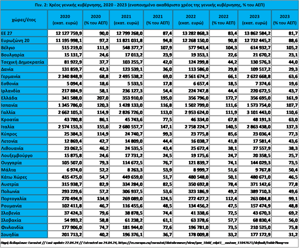 Στις 22.04.2024 δόθηκαν στην δημοσιότητα από την Eurostat τα εκτιμώμενα πραγματικά μεγέθη για το δημοσιονομικό ισοζύγιο1 και το δημόσιο χρέος2 των κρατών μελών της ΕΕ για το 2023 και τα αντίστοιχα πραγματικά μεγέθη για τα έτη 2020, 2021 και 2022.