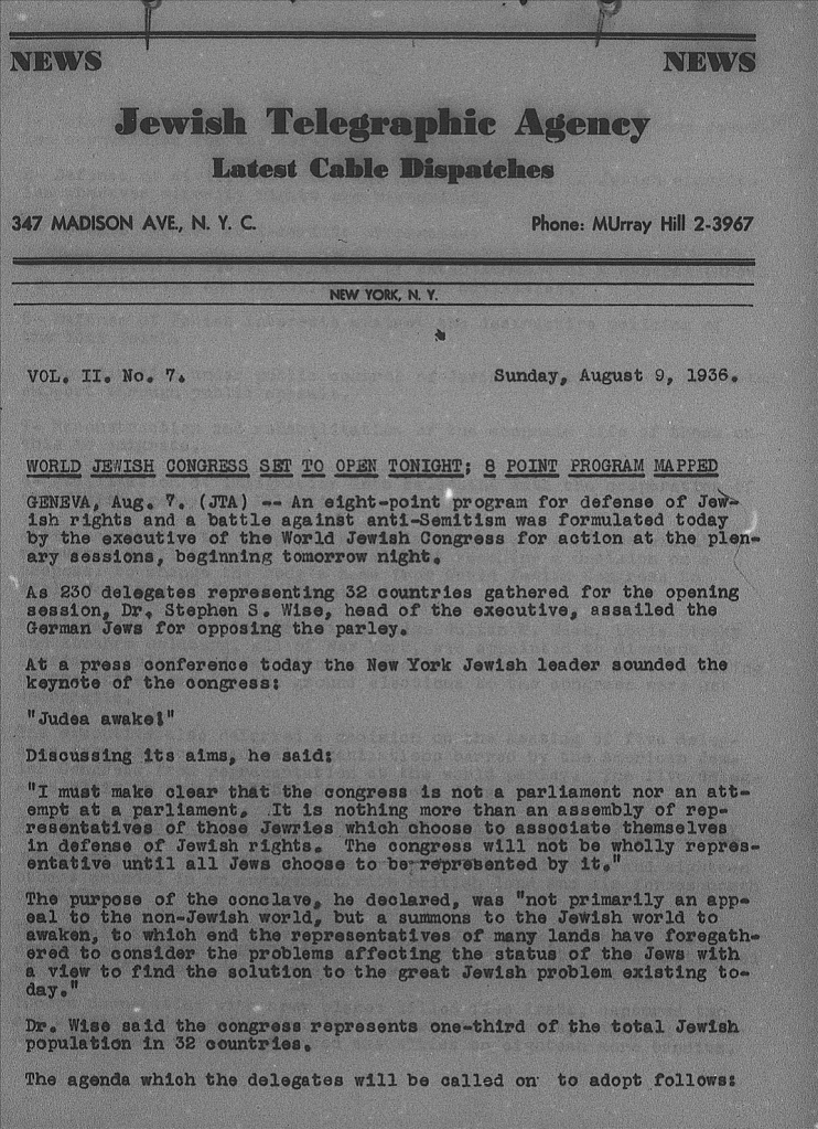8 – 15 Αυγούστου 1936: Στη Γενεύη της Ελβετίας ιδρύεται το Παγκόσμιο Εβραϊκό Κογκρέσο (World Jewish Congress – WJC). Ο σκοπός του WJC είναι διπλός: πρώτον, να συνεχίσει την παράδοση του Αμερικανοεβραϊκού Κογκρέσου (που ιδρύθηκε το 1918) και της Επιτροπής Εβραϊκών Αντιπροσωπειών (ιδρύθηκε το 1919) να λειτουργεί ως εθελοντική οργάνωση που εκπροσωπεί τις εβραϊκές κοινότητες και οργανώσεις σε όλο τον κόσμο, έναντι των κυβερνητικών αρχών και των διεθνών φορέων και, δεύτερον, να προωθήσει την ανάπτυξη της κοινωνικής και πολιτιστικής ζωής στις εβραϊκές κοινότητες σε όλο τον κόσμο (άρθρα 1 και 2 του καταστατικού του). Η οργάνωση δεν παρεμβαίνει στις εσωτερικές πολιτικές υποθέσεις οποιασδήποτε χώρας (άρθρο 3). Μόνο τα δημοκρατικά σώματα που παραμένουν αυτόνομα έχουν δικαίωμα συμμετοχής, τα οποία θα χορηγούνται, κατά γενικό κανόνα, σε ένα μόνο αντιπροσωπευτικό εθνικό εβραϊκό σώμα οποιασδήποτε χώρας (άρθρο 4). Η ολομέλεια είναι η ανώτατη αρχή του Κογκρέσου (άρθρο 5), και μια εκτελεστική επιτροπή και ένα διοικητικό συμβούλιο διευθύνουν τις υποθέσεις του (άρθρο 8).