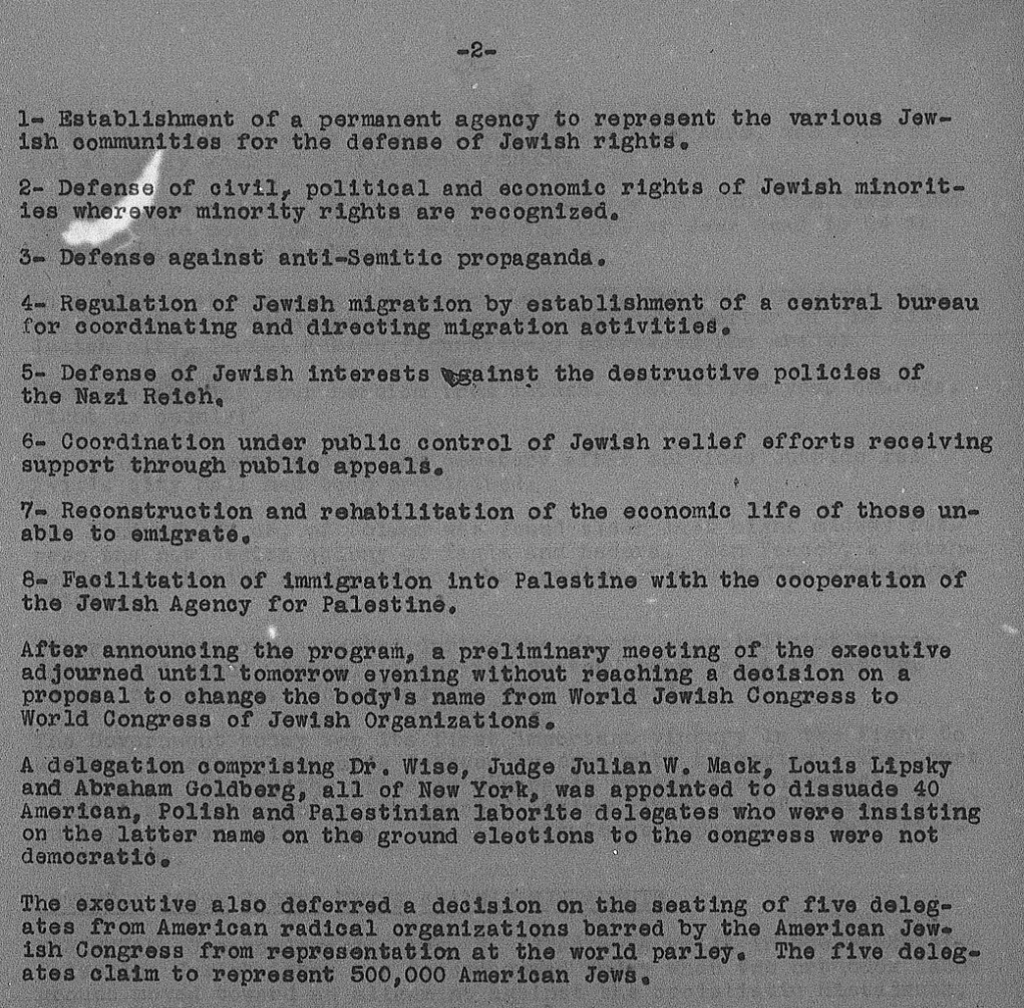Την ίδια μέρα απευθυνόμενος σε συνέντευξη Τύπου στη Γενεύη, ο Wise επιτίθεται στους Γερμανούς Εβραίους επειδή εναντιώθηκαν στο WJC, και τονίζει: «Πρέπει να ξεκαθαρίσω ότι το Κογκρέσο δεν είναι κοινοβούλιο ούτε προσπάθεια για κοινοβούλιο. Δεν είναι τίποτα άλλο από μια συνέλευση εκπροσώπων εκείνων των Εβραίων που επιλέγουν να συμπράξουν για την υπεράσπιση των εβραϊκών δικαιωμάτων. Το Κογκρέσο δεν θα είναι πλήρως αντιπροσωπευτικό έως ότου όλοι οι Εβραίοι επιλέξουν να εκπροσωπηθούν από αυτό». Ο Wise λέει ότι «το Κογκρέσο αντιπροσωπεύει το ένα τρίτο του συνολικού εβραϊκού πληθυσμού σε 32 χώρες.