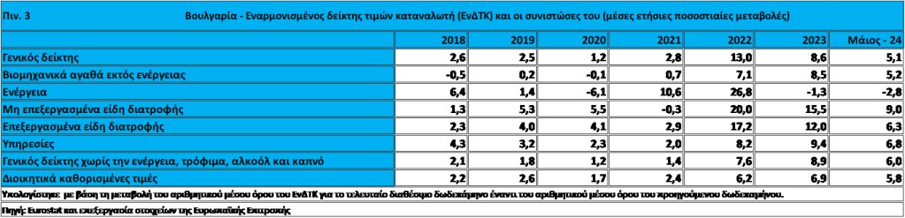 Κατά το δωδεκάμηνο μέχρι και τον Μάιο του 2024, ο μέσος ρυθμός πληθωρισμού βάσει του ΕνΔΤΚ στη Βουλγαρία ήταν 5,1%, δηλ. αρκετά υψηλότερος από την τιμή αναφοράς 3,3% για το κριτήριο της σταθερότητας των τιμών (βλ. πιν. 1, 2 και διαγ.1).