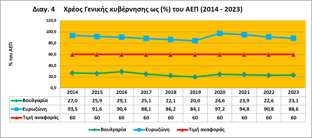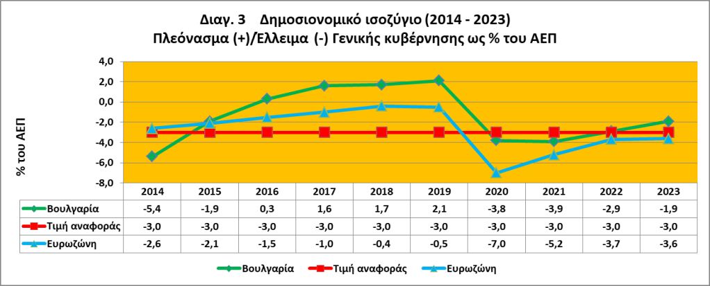 Το έτος αναφοράς 2023, ο προϋπολογισμός της γενικής κυβέρνησης της Βουλγαρίας κατέγραψε έλλειμμα 1,9% του ΑΕΠ, κάτω από την τιμή αναφοράς του ελλείμματος 3%. Ο λόγος του ακαθάριστου χρέους της γενικής κυβέρνησης προς το ΑΕΠ ήταν 23,1%, πολύ κάτω από την τιμή αναφοράς του 60% (βλ. πιν. 1 και διαγ. 3 και 4).