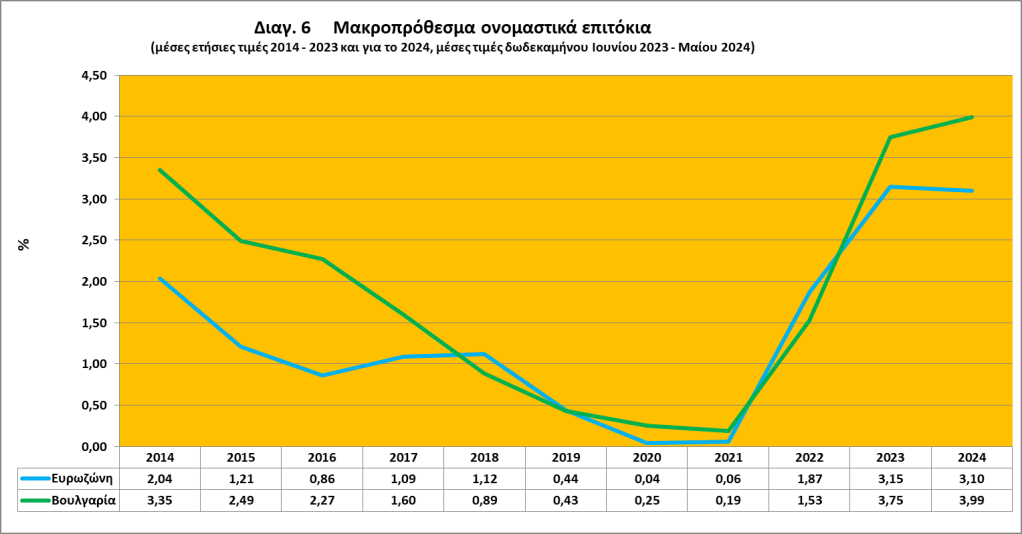 Τα μακροπρόθεσμα επιτόκια στη Βουλγαρία αυξήθηκαν ελαφρά από 3,5% τον Ιανουάριο του 2014 σε 3,9% τον Μάιο του 2024. Το πρώτο μισό της περασμένης δεκαετίας, τα μακροπρόθεσμα επιτόκια μειώθηκαν σχεδόν συνεχώς και το 2018 πλησίασαν τα επίπεδα στη ζώνη του ευρώ. Η πτώση σημειώθηκε καθώς η φθίνουσα επίδραση της παγκόσμιας χρηματοπιστωτικής κρίσης οδήγησε σε μείωση του μακροοικονομικού κινδύνου και σημαντική βελτίωση των προοπτικών του κρατικού προϋπολογισμού. Η διαφορά μακροπρόθεσμων επιτοκίων των βουλγαρικών κρατικών ομολόγων έναντι του μέσου όρου της ζώνης του ευρώ, το λεγόμενο διαφορικό επιτόκιο, μετά την μέγιστη τιμή που έλαβε τον Νοέμβριο του 2014 (1,9 ποσοστιαίες μονάδες) κυμάνθηκε μεταξύ 0,7 και 1,8 ποσοστιαίες μονάδες από το 2015 έως το τέλος του 2016. Μετά από αυτό, η διαφορά μειώθηκε σταθερά και παρέμεινε αρκετά χαμηλή (για αρκετούς μήνες ακόμα και αρνητική) μέχρι τον Μάρτιο του 2023, όταν το μέγεθός της έγινε αισθητά θετικό. Τον Μάιο του 2024 διαμορφώθηκε σε 0,9 ποσοστιαίες μονάδες (βλ. διαγ. 6).