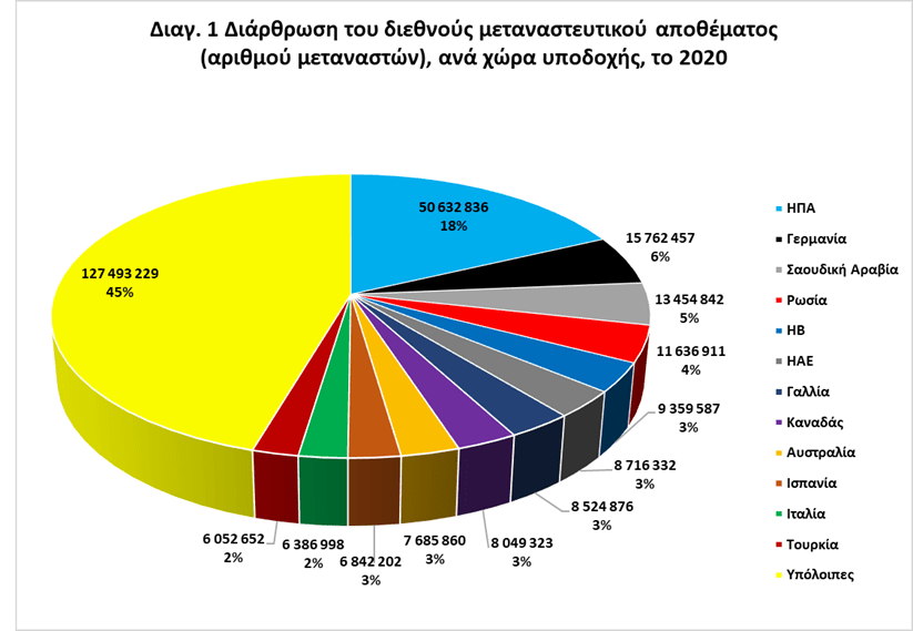 Με βάση τα πιο πρόσφατα δημοσιευμένα στοιχεία του Ο.Η.Ε. (2020), οι Ηνωμένες Πολιτείες έχουν μακράν, σε απόλυτους αριθμούς, το υψηλότερο μεταναστευτικό απόθεμα στον κόσμο από το 19703. Για το 2020 περίπου το 3,6 τοις εκατό του παγκόσμιου πληθυσμού – 280 598 105 από τα 7 887 001 292 – είναι διεθνείς μετανάστες και από αυτούς οι 50 632 836 βρίσκονταν στις ΗΠΑ. Περίπου τόσοι, όπως φαίνεται από το διάγραμμα 1, βρίσκονταν αθροιστικά, στις τέσσερις επόμενες χώρες υποδοχής (Γερμανία, Σαουδική Αραβία, Ρωσία και Ηνωμένο Βασίλειο). Ενώ ο πληθυσμός των ΗΠΑ αντιπροσωπεύει περίπου το 5 τοις εκατό του συνολικού παγκόσμιου πληθυσμού, το 18 τοις εκατό όλων των διεθνών μεταναστών κατοικούν στις Ηνωμένες Πολιτείες4. Ωστόσο, οι Ηνωμένες Πολιτείες απέχουν πολύ από το να έχουν το μεγαλύτερο μερίδιο μεταναστών στο συνολικό πληθυσμό τους. Τα Ηνωμένα Αραβικά Εμιράτα προηγούνται, με τους μετανάστες να αποτελούν το 88,1 τοις εκατό του συνόλου των κατοίκων το 2020. Το Κατάρ και το Κουβέιτ ακολουθούν στη σειρά, με 77,3 τοις εκατό και 72,8 τοις εκατό. Το Λιχτενστάιν με 67,9 τοις εκατό και το Μονακό με 67,8 τοις εκατό. Αντίθετα, τα Ηνωμένα Έθνη εκτιμούν το μερίδιο των γεννηθέντων στο εξωτερικό του πληθυσμού των ΗΠΑ, το 2020, σε 15,3 τοις εκατό.