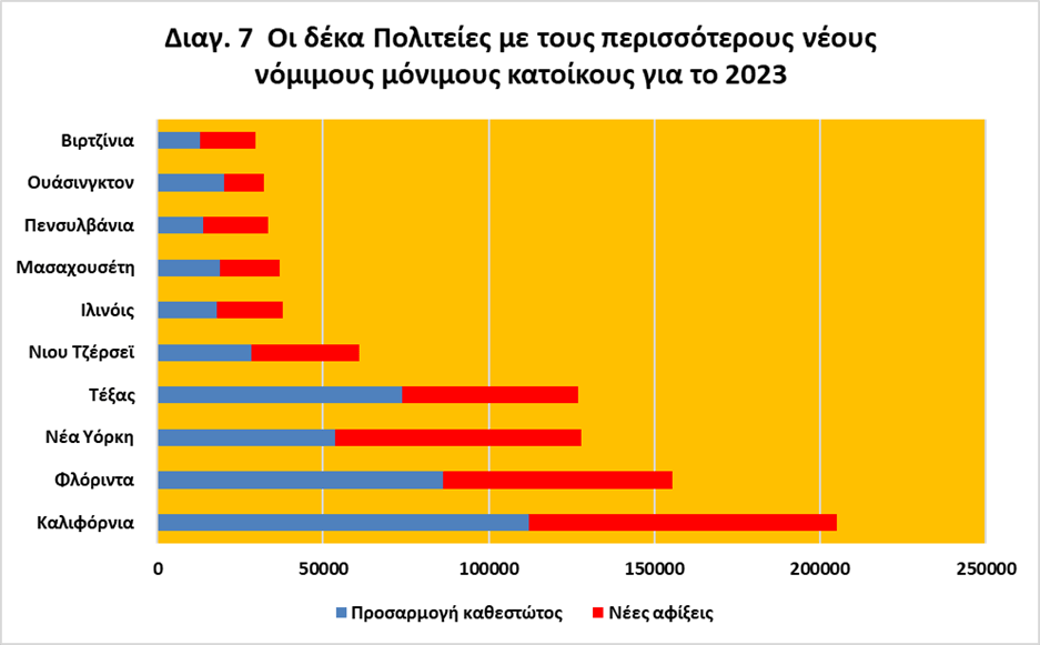 Η Καλιφόρνια με 205 040 άτομα έγινε η πολιτεία κατοικίας σχεδόν του ενός πέμπτου (18%) των μεταναστών που έλαβαν καθεστώς LPR το 2023, με πάνω από τους μισούς (54,7%) εξ αυτών να διατέθηκαν σε μετανάστες που βρίσκονταν ήδη στις Ηνωμένες Πολιτείες και προσαρμόστηκαν από άλλο καθεστώς. Ακολουθούν η Φλόριντα με 155 500 LPRs (13,3%), με προσαρμογή καθεστώτος για το 55,4%, η Νέα Υόρκη με 127 980 LPRs (10,9%), από τους οποίους οι νέες αφίξεις αποτελούσαν το 58,2%, το Τέξας με 126 930 (10,8%) με προσαρμογή καθεστώτος για το 58,3%, το Νιου Τζέρσεϊ με 60 780 LPRs (5,2%) από τους οποίους οι νέες αφίξεις αποτελούσαν το 53,2%. (βλ. διαγ. 7).