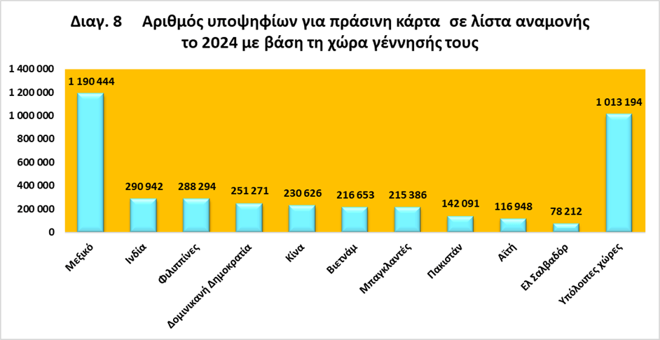 Έχοντας υπόψη ότι υπάρχουν κατηγορίες με ανώτατο αριθμητικό όριο όπως για οικογενειακή χορηγία, για εργασία, για ειδικές ομάδες μεταναστών, για βίζες διαφορετικότητας (INA Section 201) και ανώτατο όριο ανά χώρα (7% τοις εκατό του συνολικού αριθμού θεωρήσεων) (INA Section 202) υπάρχουν σημαντικά μεγάλες λίστες αναμονής. Οι δέκα χώρες με τον υψηλότερο αριθμό καταγεγραμμένων αιτούντων για βίζα κατά το δημοσιονομικό έτος 2024 παρατίθενται στο διάγραμμα 8. Μαζί αυτές χώρες καταγωγής αντιπροσωπεύουν το 74.9% του συνολικού αριθμού των υποψήφιων LPR για το 2024. Το διάγραμμα περιλαμβάνει όλες τις χώρες με τουλάχιστον 78 000 άτομα στη λίστα αναμονής.