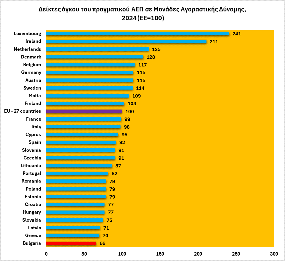 Πραγματικό κατά κεφαλήν ΑΕΠ της Βουλγαρίας και των άλλων χωρών μελών της Ευρωπαϊκής Ένωσης