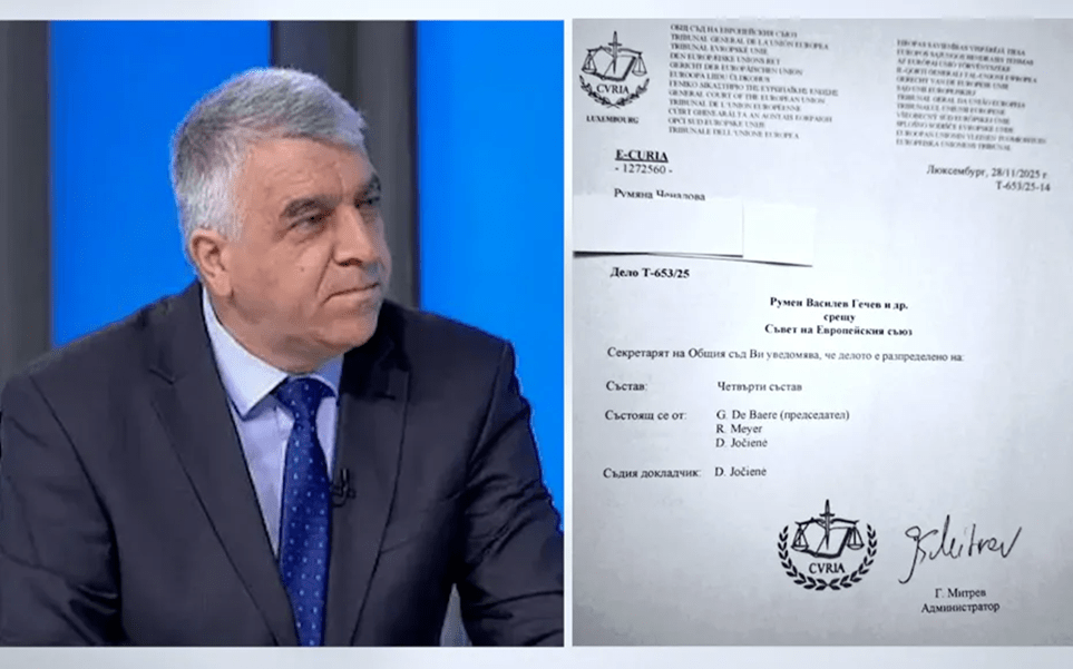 Δεξιά: Η πράξη κοινοποίησης της καταχώρησης της προσφυγής από τη Γραμματεία του Γενικού Δικαστηρίου της Ευρωπαϊκής Ένωσης προς τον διάδικο Ρούμεν Γκέτσεφ και τους υπόλοιπους